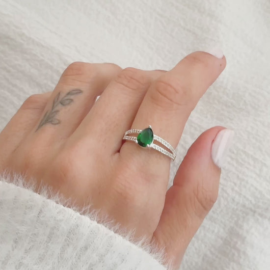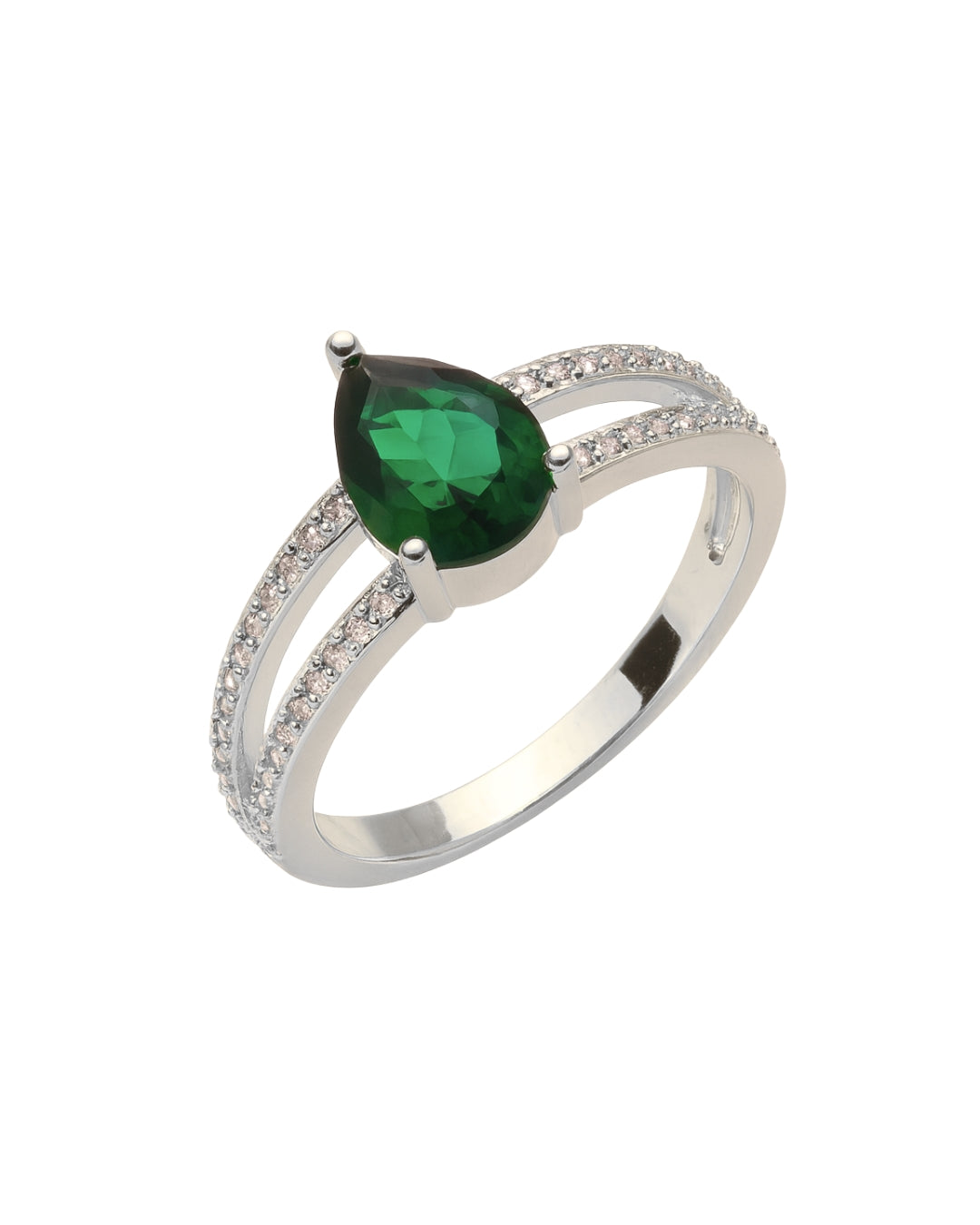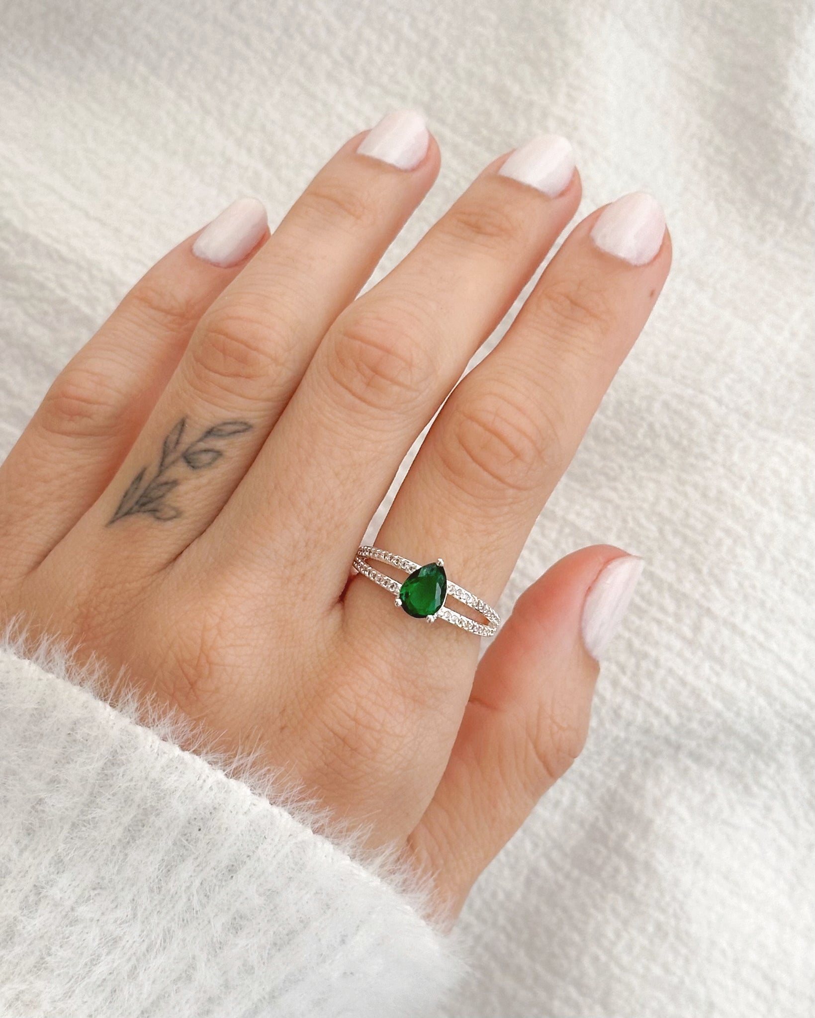 Anel Gota com Pedra Verde Zircônias em Prata Semijoia Sofisticada