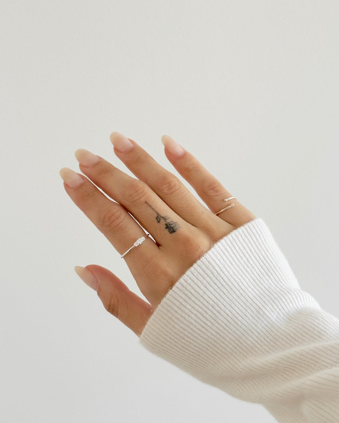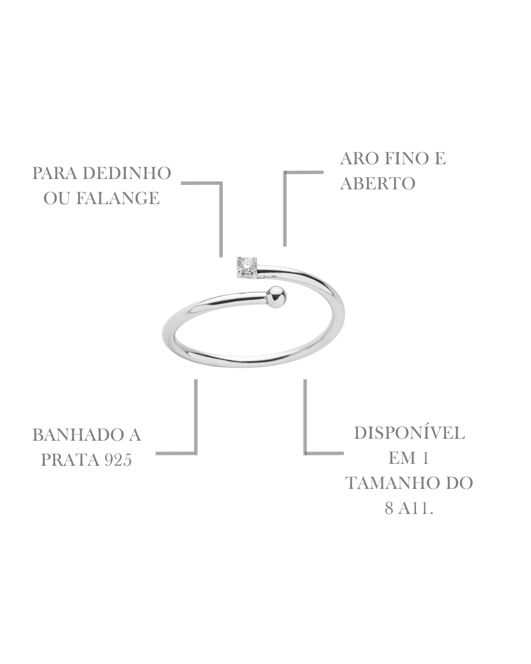Um anel delicado e moderno, com aro fino aberto que combina dois detalhes: uma bolinha polida de um lado e uma zircônia lapidada de alto brilho do outro. O design minimalista transmite sofisticação e versatilidade, ideal para ser usado sozinho ou em mix de anéis.