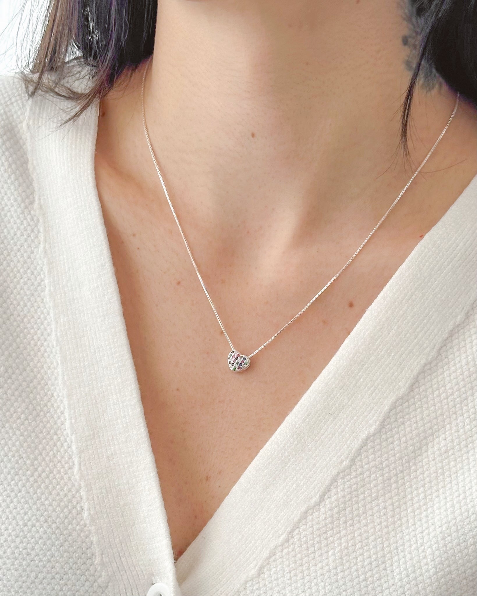 Colar Coração Colorido com Zircônias em Prata Semijoia Minimalista