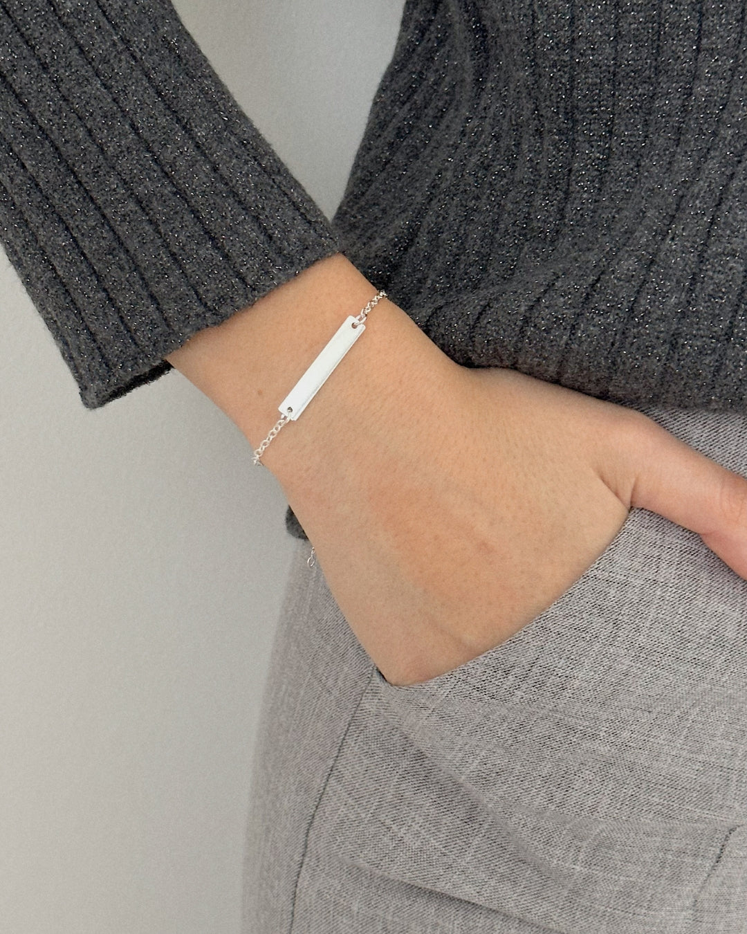 Uma pulseira delicada e sofisticada, com chapa retangular que pode ser personalizada com o nome de sua escolha. O design minimalista a torna atemporal e perfeita tanto para uso diário quanto como presente especial e cheio de significado.