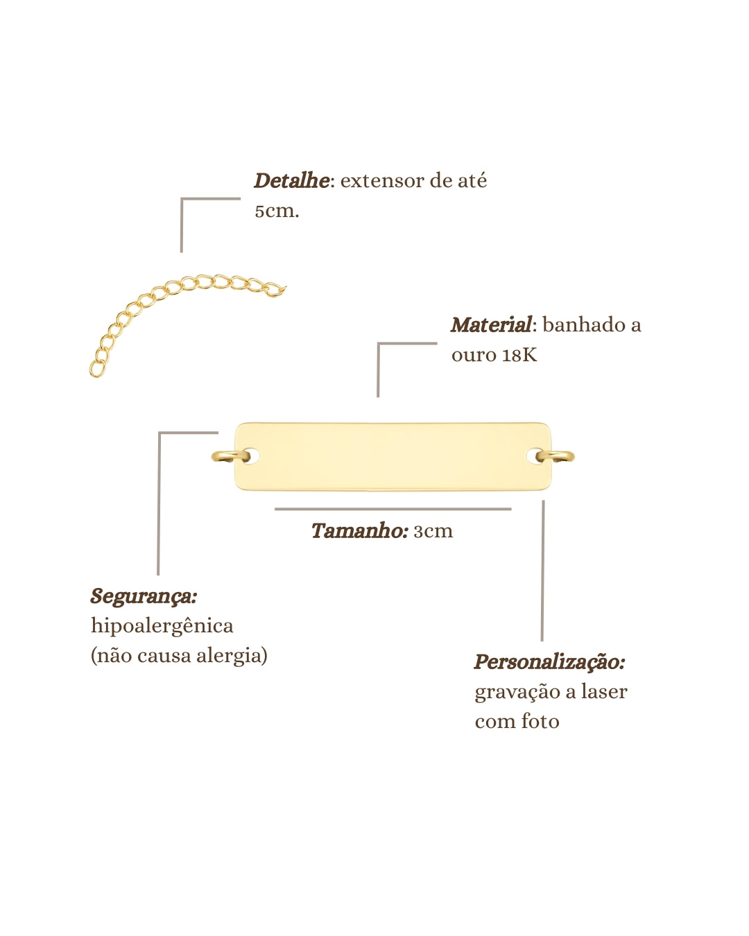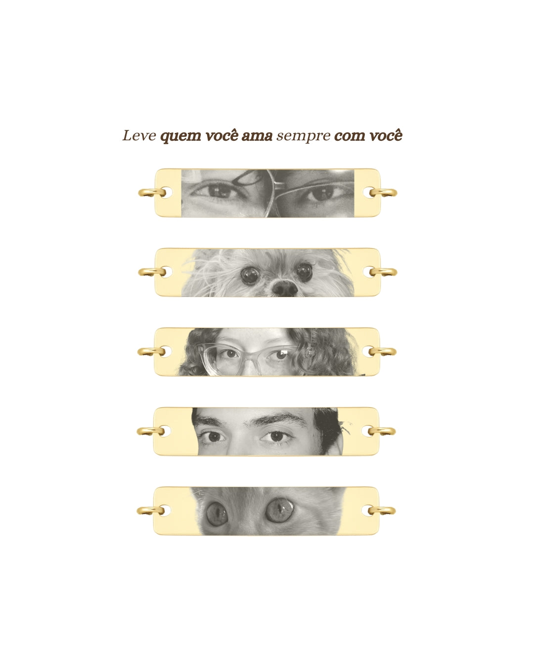 Uma pulseira delicada e sofisticada, com chapa retangular que pode ser personalizada com um olhar de quem você ama. O design minimalista a torna atemporal e perfeita tanto para uso diário quanto como presente especial e cheio de significado.