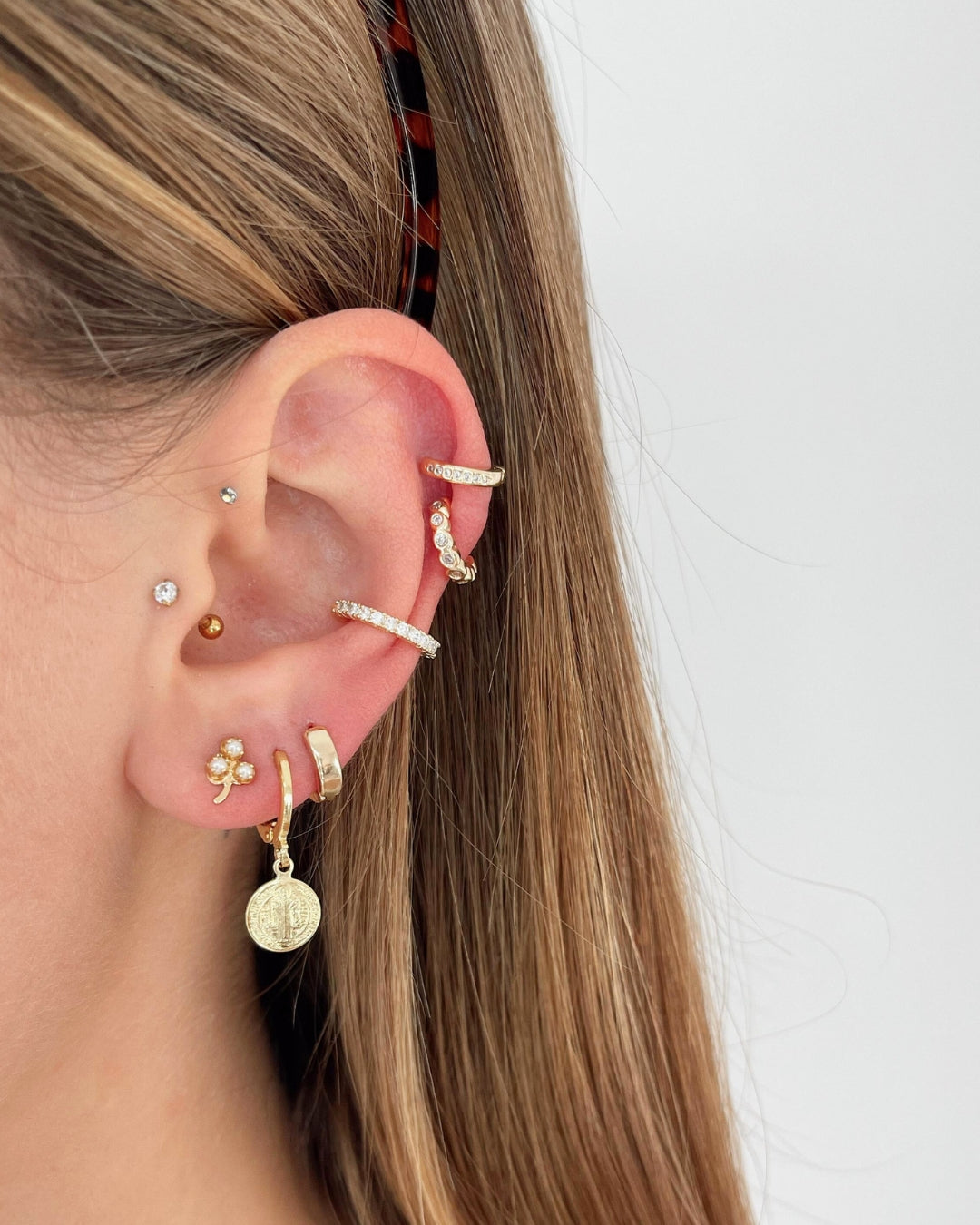 Um piercing de pressão delicado, sofisticado e cravejado em zircônias. Ideal se você quer dar um toque a mais na composição da orelha, sem a necessidade de furo. Trazendo estilo e praticidade em uma única peça.