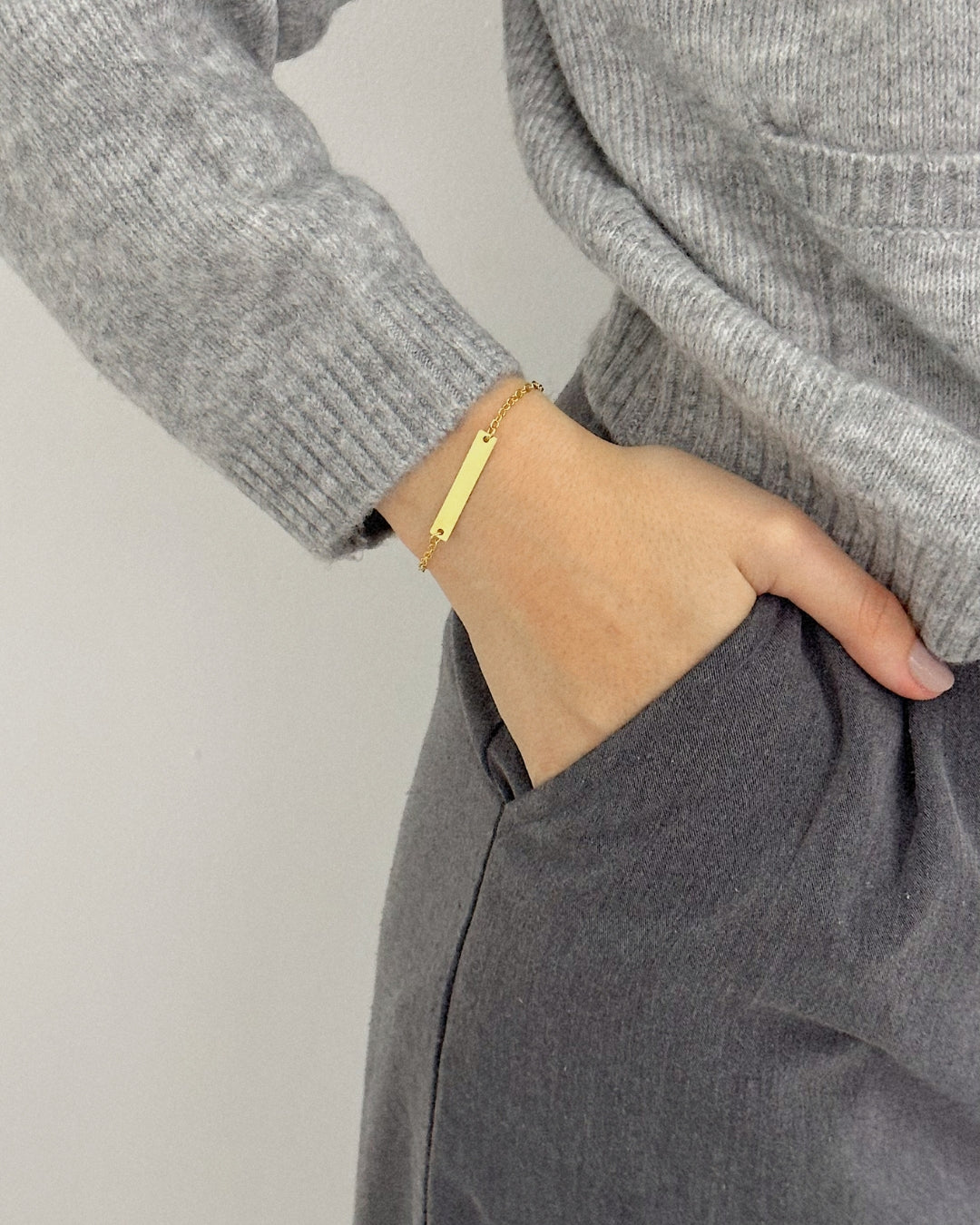 Uma pulseira delicada e sofisticada, com chapa retangular que pode ser personalizada com uma escrita especial. O design minimalista a torna atemporal e perfeita tanto para uso diário quanto como presente especial e cheio de significado.
